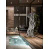 Figura de leopardo sentado, realizada en fibra de vidrio y decorada con mosaico de teselas rectangulares de espejo plata, sobre fondo blanco. Mira hacia la derecha.