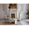 Figura realizada en fibra de vidrio y resina de poliester, acabado ba?o de oro brillo. Pedestal de gres porcel?nico s?mil m?rmol blanco. Aro de acr?lico opal con luz LED. 3,2W LED, 360 lm, 3000 k.