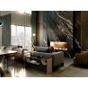 Figura realizada en fibra de vidrio y resina de poliester, acabado ba?o de oro brillo y base met?lica negro mate. Tulipa esf?rica de acr?lico acabado opal mate.