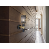 L?mpara de pared realizada en metal acabado negro mate, con detalles de lat?n satinado. Tulipa de cristal moldeado acabado gris smoke espejado.