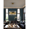 L?mpara redonda de 14 luces, realizada en metal cepillado acabado oro. Difusor de barras de cristal transparente en forma de prisma.