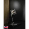 L?mpara sobremesa de 1 luz realizada en metal acabado cromo. Doble tulipa la exterior de cristal moldeado y la interior de copens facetados de cristal transparente y smoke. Clavija tipo G (Inglesa).