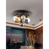 Plaf?n de techo de 5 luces realizada en metal acabado negro mate, con detalles de lat?n satinado. Tulipas de cristal esf?ricas de 12 y 20 cm, en acabados ambar y gris smoke espejado.