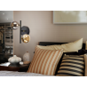 L?mpara de pared de 2 luces realizada en metal acabado negro mate, con detalle de lat?n satinado. Tulipas de cristal esf?rica ambar y smoke de 12 cm.
