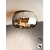 Plaf?n realizado en metal acabado cromo. Tulipa de cristal espejado. L?grimas interiores de cristal tipo murano. DIMABLE. Incluye mando a distancia.
