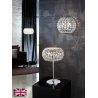 Lámpara sobremesa de 3 luces realizada en metal acabado cromo. Tulipa compuesta por copens cuadrados de cristal transparente. Incluye difusor superior de cristal opal. Clavija tipo G (Inglesa).