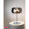 L?mpara sobremesa de 3 luces realizada en metal acabado cromo. Tulipa de cristal espejado y l?grimas interiores de cristal tipo murano. Clavija tipo G (Inglesa).