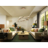 L?mpara de 2 aros ( ?60 y ?80cm), realizada en acero y aluminio, acabado ba?o de oro brillo. Difusor de acr?lico facetado transparente. Regulable en altura. 68W LED,4.700 lm, 3,000K. DIMABLE, con control remoto y con APP.