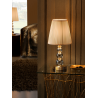 Sobremesa peque?o de 1 luz. Realizado en cristal de color champ?n, partes metalicas y base en acabado lat?n envejecido. Pantalla encintada de color beis.
