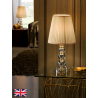 Sobremesa peque?o de 1 luz. Realizado en cristal de color champ?n, partes metalicas y base en acabado lat?n envejecido. Pantalla encintada de color beis.