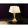 L?mpara sobremesa peque?a de 1 luz, realizada en madera y metal. Acabado en pan de oro y base cuadrada acabado nogal. Pantalla textil s?mil seda.