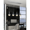 L?mpara de 4 luces LED, realizada en metal acabado cromo. Tulipas con forma de gota realizadas en cristal macizo con burbujas decorativas en su interior. Regulables en altura. 4x5W LED. 1.600 lm. 3.000 K.