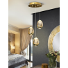 L?mpara de 3 luces LED, realizada en metal acabado dorado. Tulipas con forma de gota realizadas en cristal tono champ?n, macizo, con burbujas decorativas en su interior. Regulables en altura. 15W LED. 1.440 lm. 3.000 K.