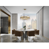 L?mpara redonda de 18 luces, realizada en metal cepillado acabado oro. Difusor de barras de cristal transparente en forma de prisma.