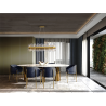 L?mpara ovalada de 28 luces, realizada en metal cepillado acabado oro. Difusor de barras de cristal transparente en forma de prisma.