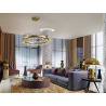 Gran l?mpara redonda de 26 luces, realizada en metal cepillado acabado oro. Difusor de barras de cristal transparente en forma de prisma.