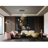 L?mpara realizada en metal acabado negro. 5 Tulipas de cristal ambar. Regulable en altura. 60W LED, 3.000 K., 3600 lm. Incluye driver TRIAC y SET DIMADO.
