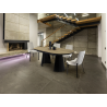 Mesa de comedor extensible, realizada en metal acabado negro mate y tapa de DM con superficie melaminica de alta resistencia, acabado madera, con cantos en negro mate. Extensible hasta 4 metros.