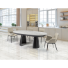 Mesa de comedor extensible, realizada en metal acabado negro mate y tapa de DM con superficie melaminica de alta resistencia, acabado m?rmol blanco brillo, con cantos en negro mate.Extensible hasta 4 metros.