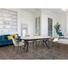 Mesa de comedor extensible, realizada en metal acabado negro mate y tapa de DM con superficie melam?nica de alta resistencia, acabado m?rmol blanco brillo, con cantos en negro mate. Extensible hasta 2,85 metros.
