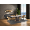 Mesa de comedor realizada en DM contrachapado en roble oscuro, acero inoxidable acabad oro rosa. Tapa de porcel?nico de 5 mm, acabado m?rmol veteado, con cantos redondeados.