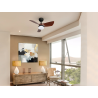 Ventilador de techo con luz LED DIMABLE y CCT (temperatura de luz regulable). Realizado en metal acabado negro mate y aspas en acr?lico acabado madera de nogal. Difusor acr?lico opal. Motor DC, 6 velocidades e inversi?n. Temporizador, funci?n brisa