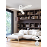 Ventilador de techo con luz LED. Dimable. Realizado en metal y aspas en madera, acabado blanco. Difusor de cristal opal. Ventilador con Motor DC de 6 velocidades e inversi?n. LED CCT de 3 tonos de temperatura de color. Temporizador.